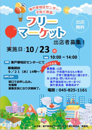 東戸塚地区センターまつり期間の2日目(10/23日曜日)に館内にて、子育て用品のフリーマーケットを実施致します。お子さんが着られなくなってしまった洋服、体操着、おもちゃなど、フリーマーケットでリサイクルしませんか?おうちも片付き、エコにもつなが…