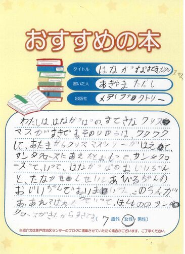 7さいのおんなのこが『はなかっぱのすてきなクリスマス』のしょうかいぶんをかいてくれました。 いっしょうけんめいかいてくれてありがとう。だいすきなきもちがつたわってきます。 センターのとしょコーナーにはらせてもらいますね。 (東戸塚地区センター…