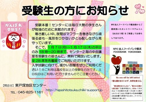 1月7日~17日の平日8日間限定ですが、空調も新しくなり会議室はとても暖かいです。ぜひ勉強にご活用ください。