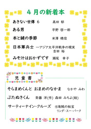 桜の季節がいつの間にか過ぎてしまい、葉桜の季節になりました。 東戸塚地区センターは2019年10月に30周年を迎えます。 さらに快適で、居心地の良いセンターを目指してまいりますので、どうぞよろしくお願いいたします。 4月の図書コーナー新着本をご紹介い…