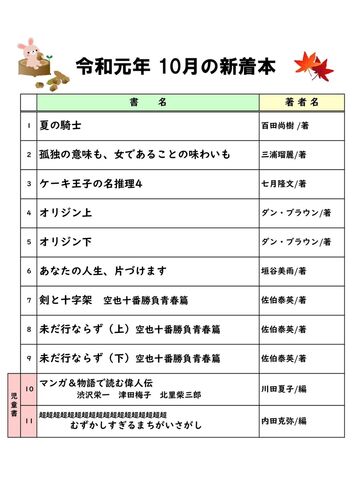 令和元年10月の新着本を配架いたしました。今月はご利用者の皆さまからの「リクエスト本」もご用意しております。どうぞ図書コーナーにお立ち寄りください。