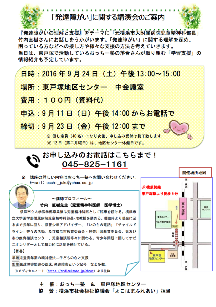 2016-09-06 9/24(土)発達障がいに関する講演会のご案内 東戸塚地区で活動するおっちー塾の落合先生のご協力で竹内先生の講演会を行うことになりました。発達障がいについての知識を深め、様々な支援の方法について一緒に学んでみませんか?