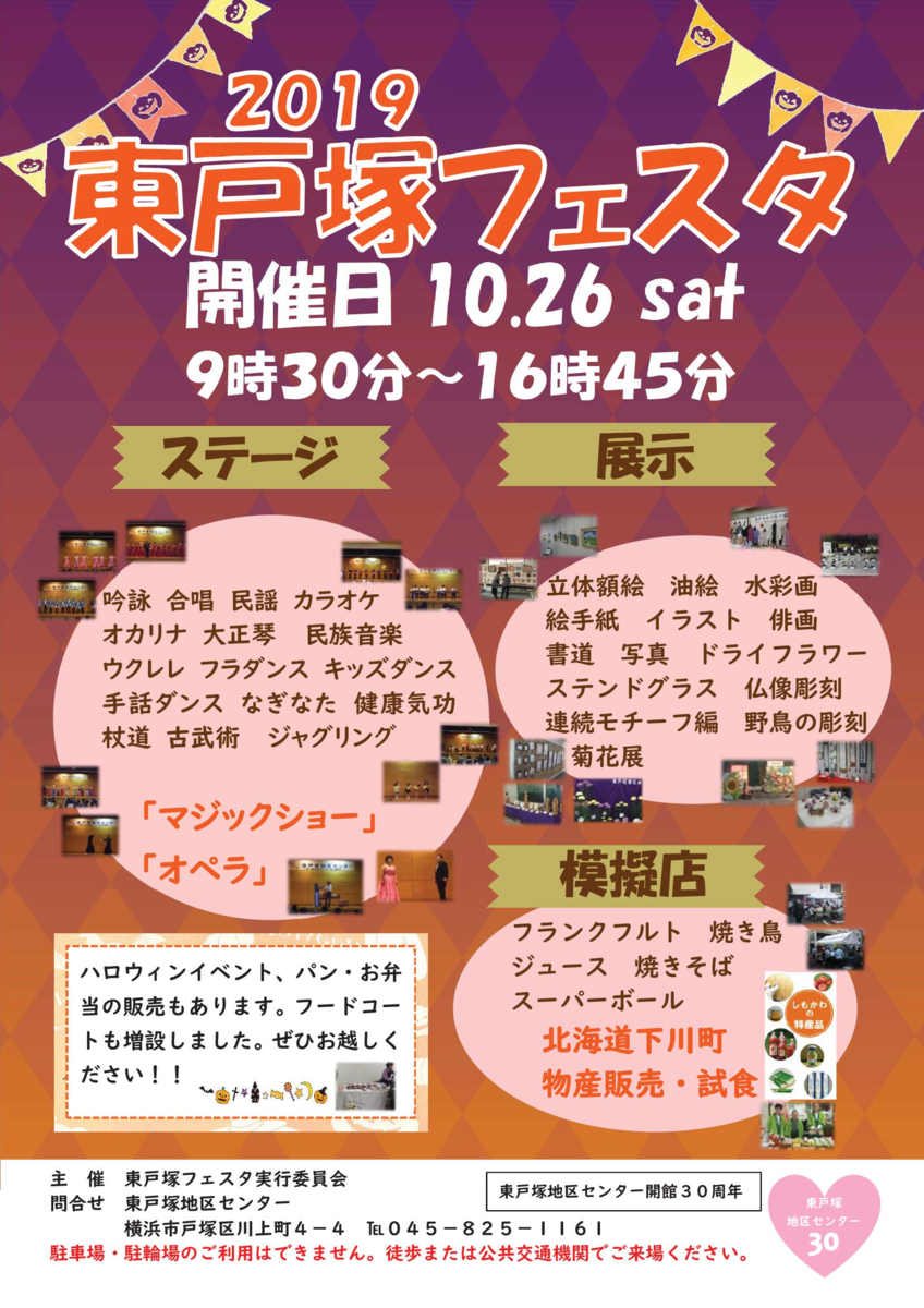 2019-10-05 令和元年度 東戸塚地区センターまつり 東戸塚地区センターまつり「東戸塚フェスタ」を開催いたします。 体育室ステージでの発表や、館内での作品展示・実演・作品販売、各連合町内会による模擬店など、楽しいイベントが盛りだくさんの「東戸塚フェスタ」にぜひご来場ください。お待ちしております。
