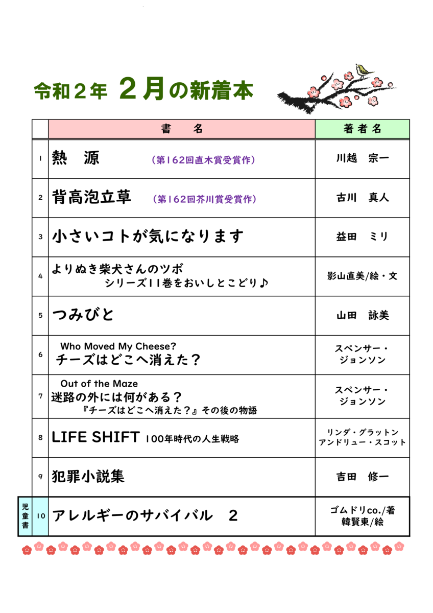 2020-02-03 令和2年2月の新着本 今日は節分、「親子の遊び場ころりん広場」が開催されたプレイルームからは、小さな子どもたちの「豆まき」をする可愛い声が聞こえてきました。 本日2月の新着本を配架いたしました。第162回直木賞・芥川賞受賞作2冊もございます。皆様のご利用をお待ちしております。