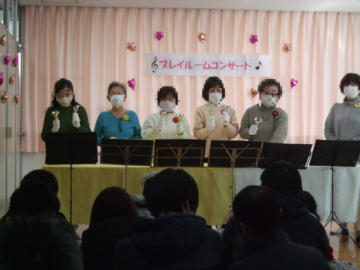 2月24日、第2回プレイルームコンサートを開催しました。今回お招きしたのは「ミュージックブーケ」の皆さんです。ミュージックベルやコーラス、ピアノにフルートと、様々な音色でお子様から大人の方まで楽しめる曲を披露してくださいました。